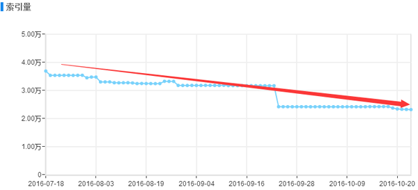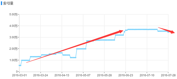 如上图小编是今年三月份开始接手的这个网站项目,当时并木有通过逆向思维去解决网站存在的收录问题,只是经验性的简单分析了一下网站的日志,在站长后台增加了sitemap推送和在服务器上部署了主动推送功能,短时间内的确效果明显,该频道的页面收录呈现良好的上升趋势,可是通过图表可以看出,收录量在达到6月份的时候一直到7月份中旬没有进行任何明显的变化,从7月中旬之后小编当时就有一种危机感,职业上的直觉告诉我,接下来一段时间该频道的收录会呈现大幅下降的趋势,结果果不其然,如下图: